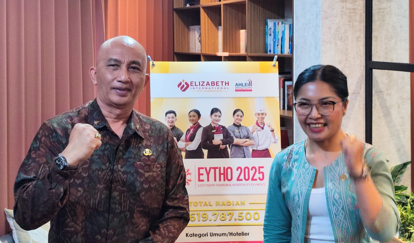 (Dutabalinews.com), Elizabeth International kembali menggelar Ezzy Youth Tourism & Hospitality Olympics (EYTHO) tahun 2025. Acara ini dibuka Kepala Dinas Ketenagakerjaan dan ESDM Provinsi Bali Ir. Ida Bagus Setiawan, S.T., M.Si. didampingi Direktur Elizabeth International Putu Sri Budani, A.M. Par, S.M.,HTS., Senin (20/1/2025) bertempat di Ezzy Smart Ballroom, Elizabeth International Denpasar, Jl. Hayam Wuruk No.199.